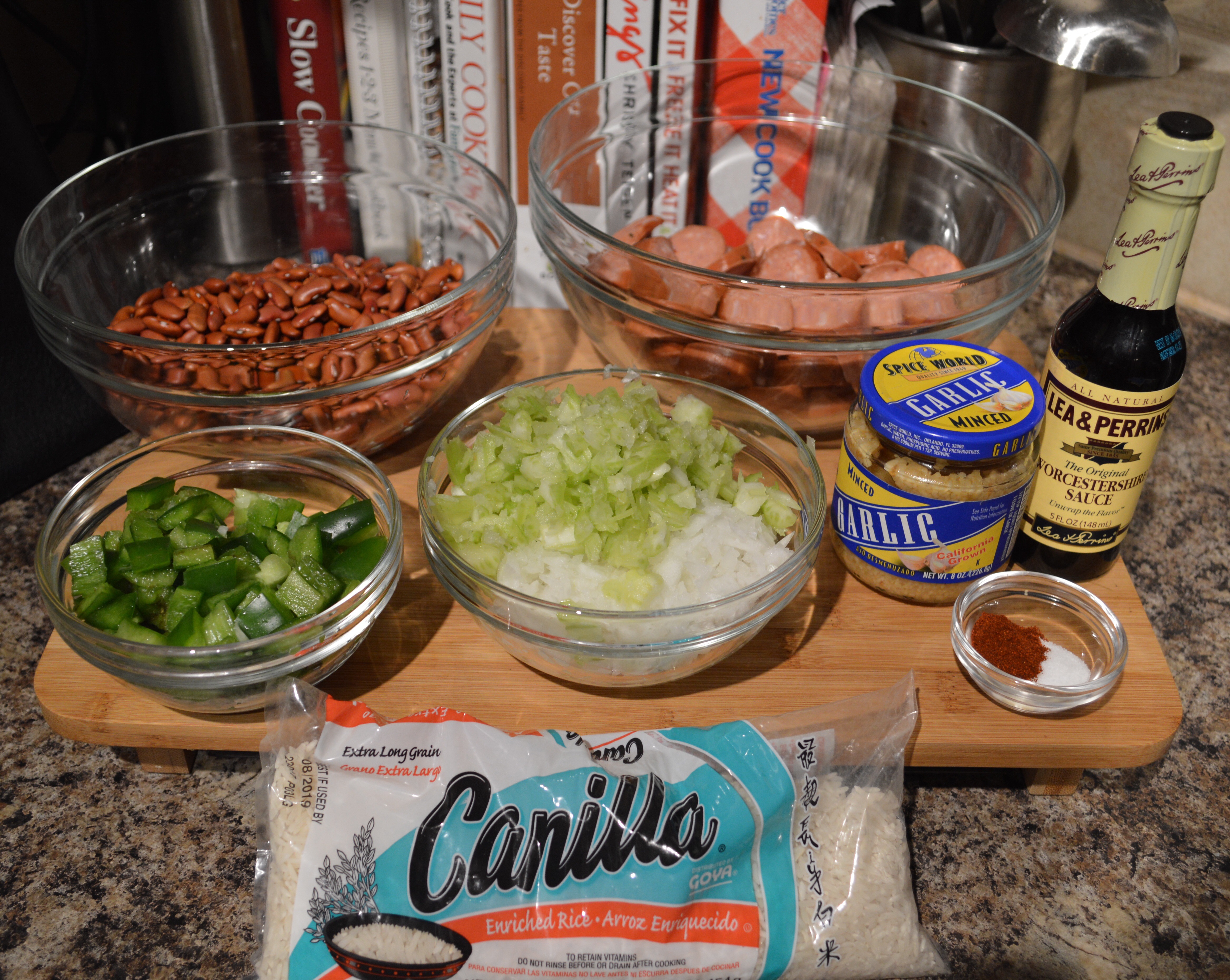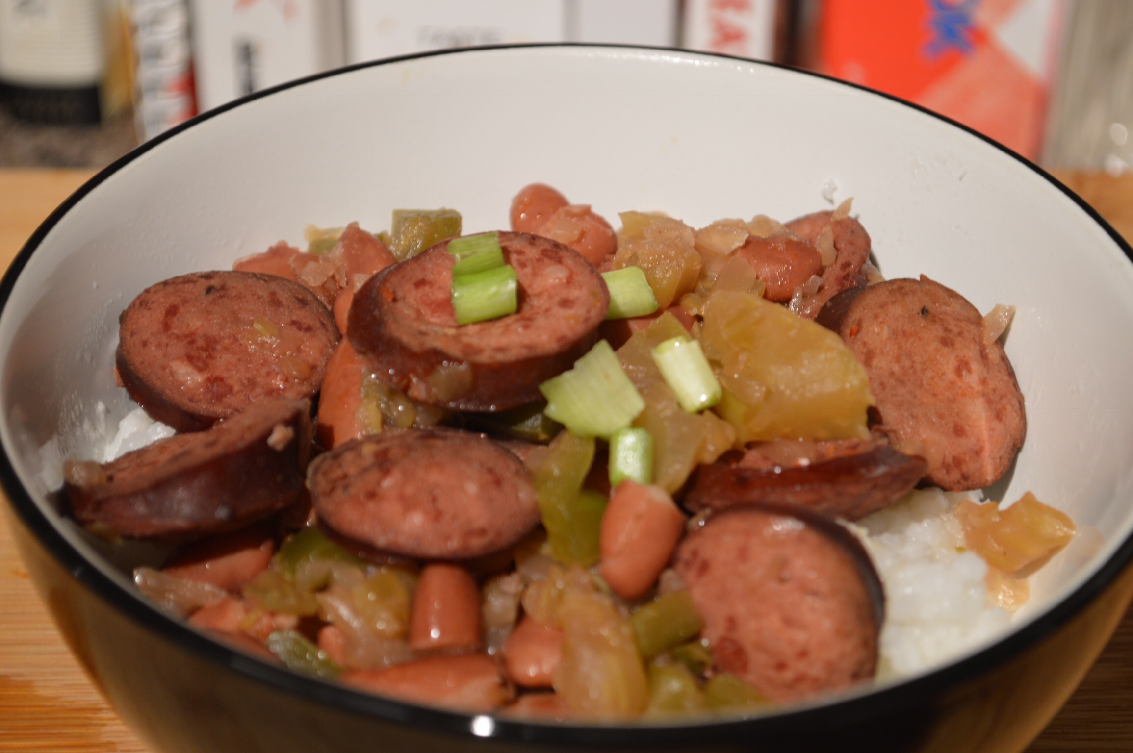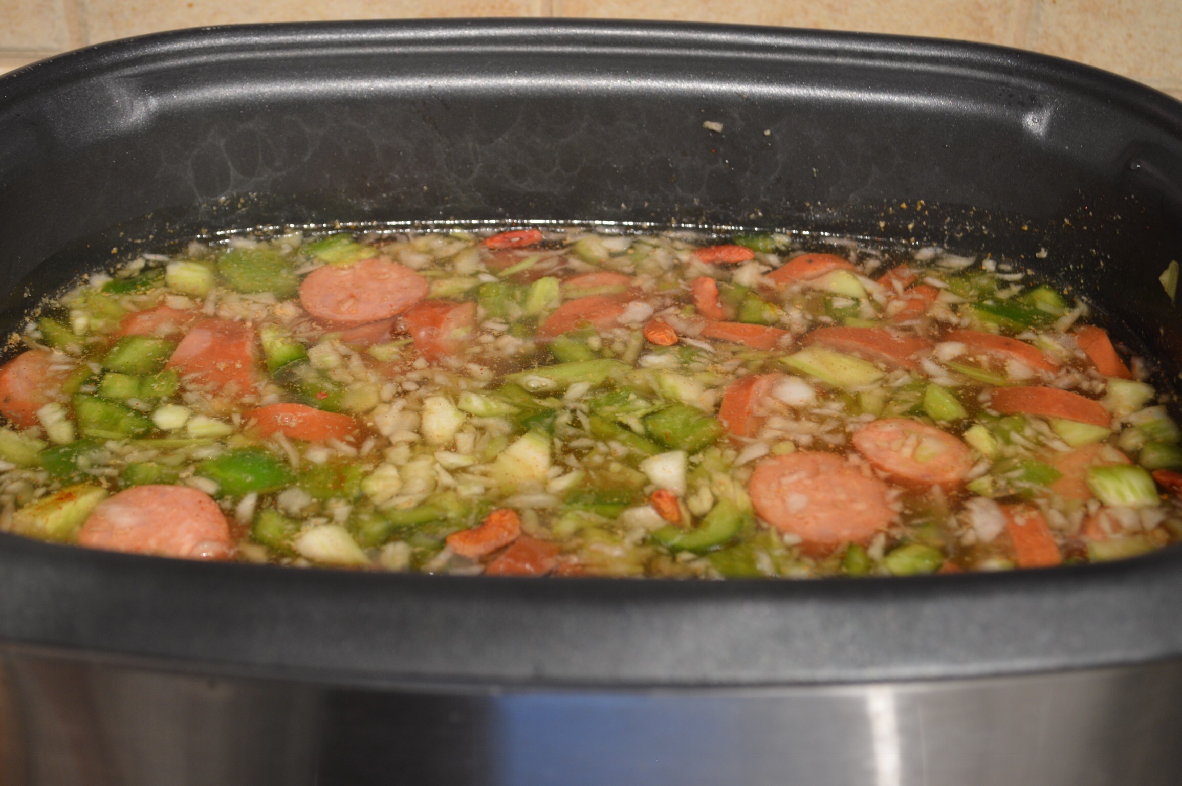 - Chop celery, onion, and bell pepper. Slice smoked sausage into rounds.